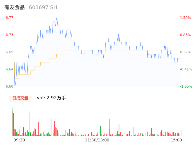 04月11日,有友食品收报6.68,股价涨幅0.15%,成交金额1955.93万元,换手率0.68%。