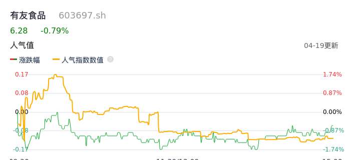 04月19日,有友食品收报6.28,股价涨幅-0.79%,成交金额2317.08万元,换手率0.87%。
