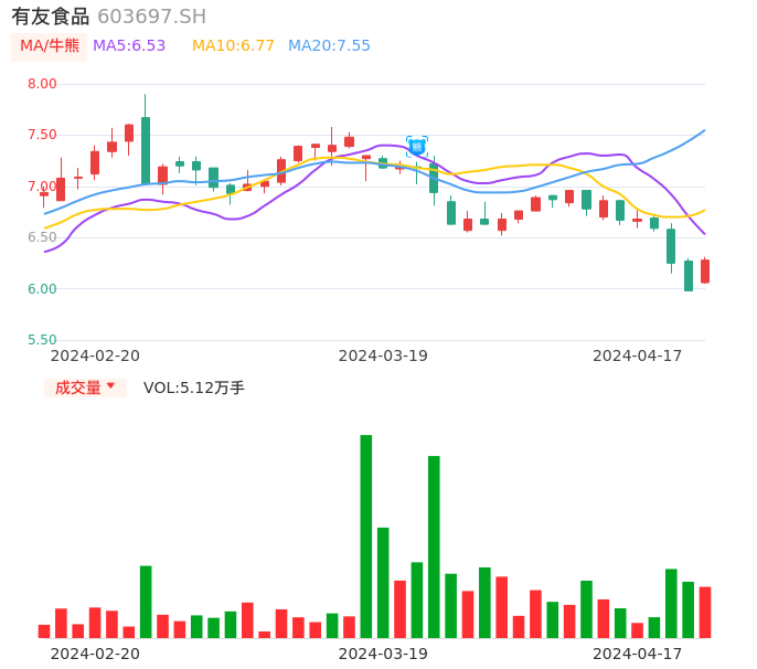 04月17日,有友食品收报6.28,股价涨幅5.02%,成交金额3187.85万元,换手率1.20%。