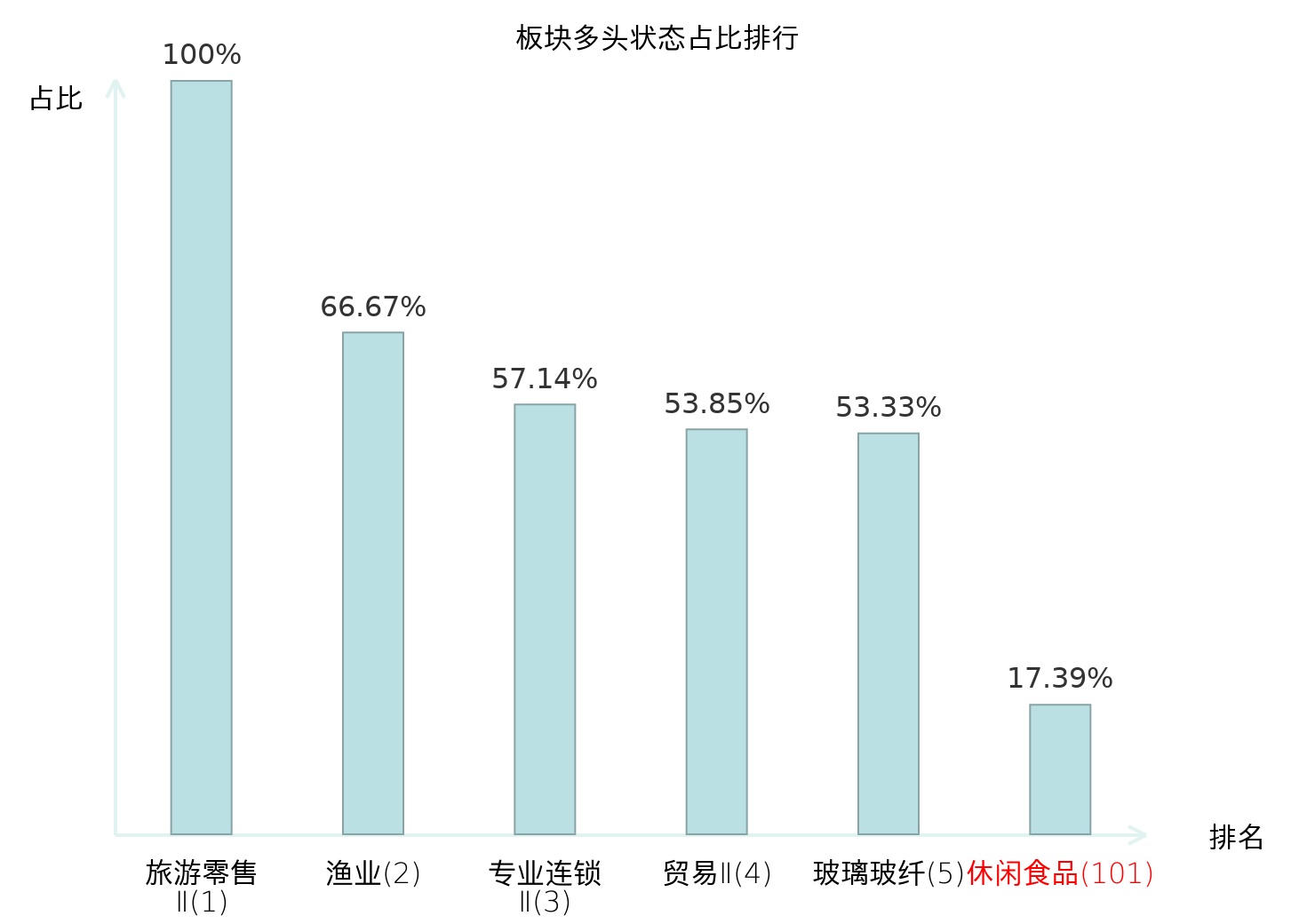 全市场所有行业板块中主力多头状态占比排名中,旅游零售Ⅱ板块位居第一。农业综合Ⅱ板块名次提升最快,较昨日上升83位。
