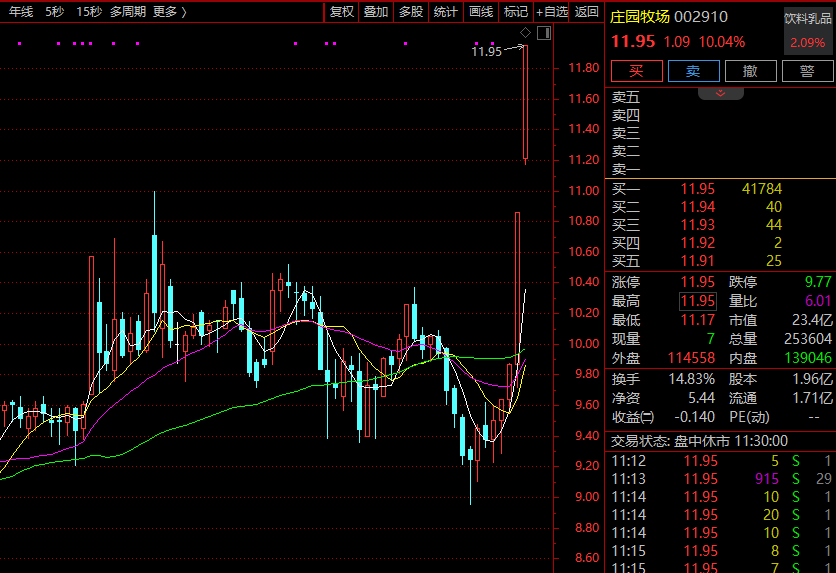 食品饮料股早间集体走强,饮料乳品方向领涨,板块指数一度放量大涨逾2%,连续第5日上扬。庄园牧场(002910)开盘仅约5分钟就直线涨停,连续第2日封板,养元饮品亦触及涨停,新乳业、麦趣尔、东鹏饮料等涨幅居前。