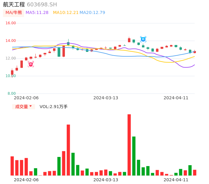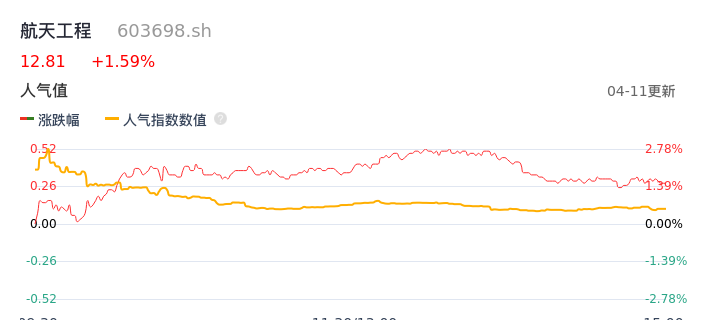 04月11日,航天工程收报12.81,股价涨幅1.59%,成交金额3727.21万元,换手率0.54%。
