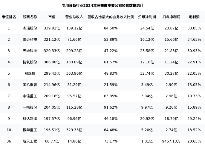 航天工程最新报告期数据为三季度,下表汇总了专用设备行业内市值靠前的公司三季度主要经营数据