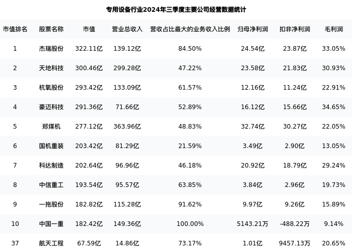 航天工程最新报告期数据为三季度,下表汇总了专用设备行业内市值靠前的公司三季度主要经营数据