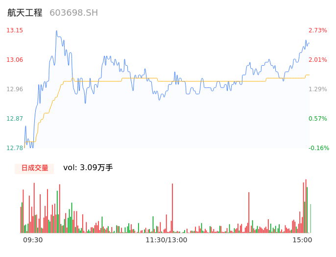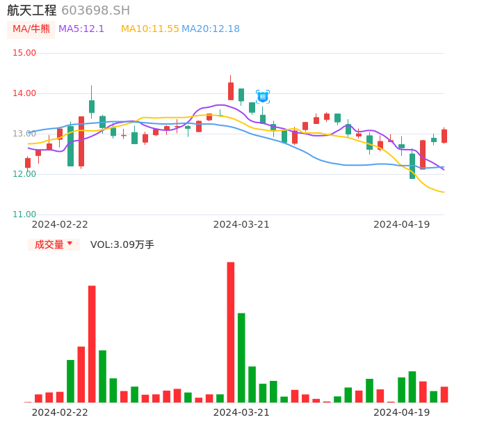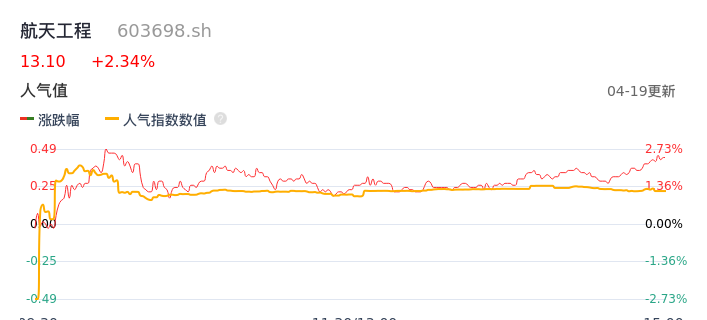 04月19日,航天工程收报13.10,股价涨幅2.34%,成交金额4018.54万元,换手率0.58%。