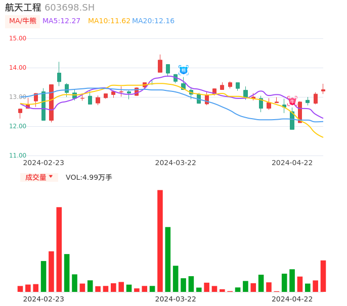 04月22日,航天工程收报13.25,股价涨幅1.15%,成交金额6634.21万元,换手率0.93%。