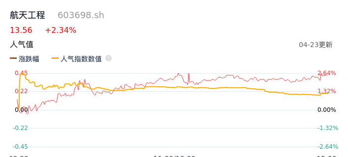 04月23日,航天工程收报13.56,股价涨幅2.34%,成交金额6957.93万元,换手率0.96%。