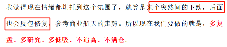 我觉得现在情绪都烘托到这个氛围了,就算是来个突然间的下跌,后面也会反包修复,参考商业航天的走势。所以现在我们要做的就是,多复盘、多研究、多低吸、不追高、不满仓。