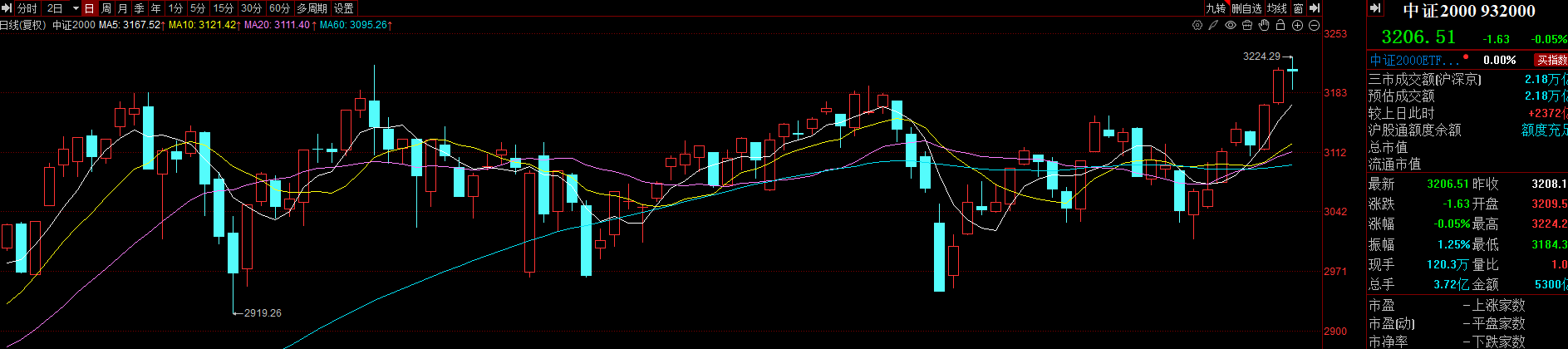 中证2000的走势上午还是比较好的,慢慢爬坡创新高,突破的走势。随着盘中两次跳水,把2000的指数带下了水,收出了探底针阴线,不是很漂亮,下周还需要看看能不能分歧转一致。