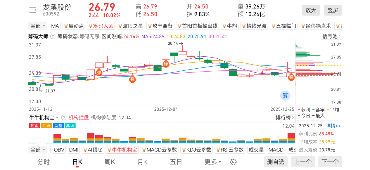 3)20251226-龙溪股份-600592-【筹码大师】和【牛牛机构宝】-近期出现弹信号且底部量柱由绿转红
