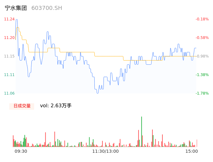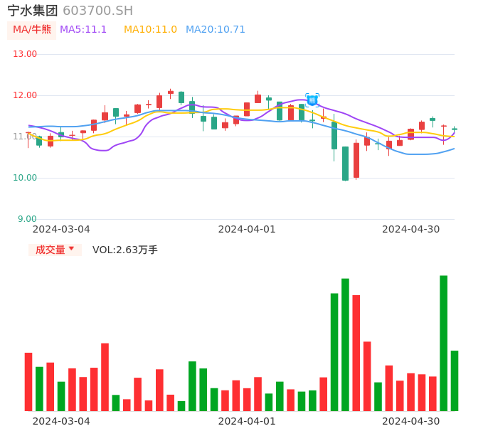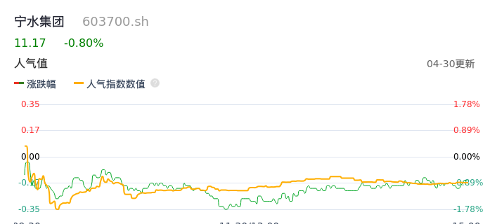 04月30日,宁水集团收报11.17,股价涨幅-0.80%,成交金额2935.12万元,换手率1.30%。