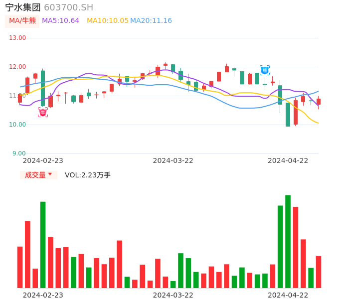 04月22日,宁水集团收报10.89,股价涨幅0.65%,成交金额2422.56万元,换手率1.10%。
