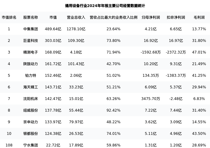 宁水集团最新报告期数据为年报,下表汇总了通用设备行业内市值靠前的公司年报主要经营数据
