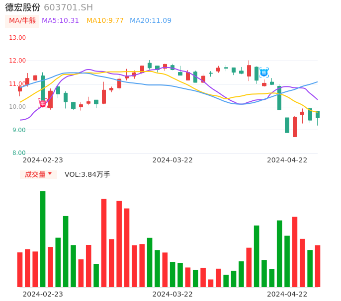 04月22日,德宏股份收报9.52,股价涨幅1.06%,成交金额3659.78万元,换手率1.47%。