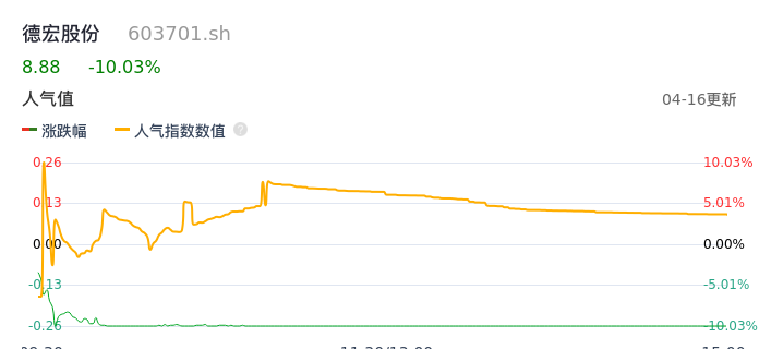 04月16日,德宏股份收报8.88,股价涨幅-10.03%,成交金额4037.60万元,换手率1.71%。
