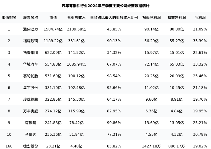 德宏股份最新报告期数据为三季度,下表汇总了汽车零部件行业内市值靠前的公司三季度主要经营数据
