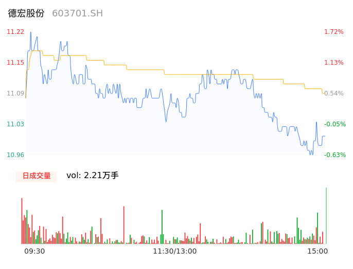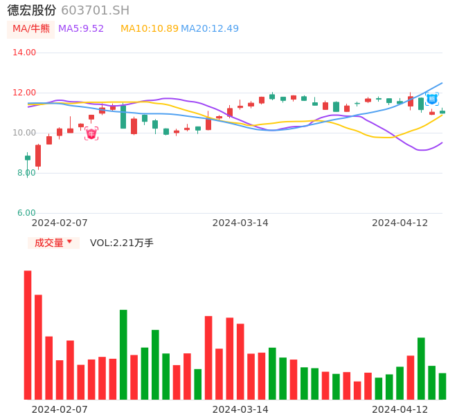 04月12日,德宏股份收报10.97,股价涨幅-0.54%,成交金额2452.71万元,换手率0.85%。