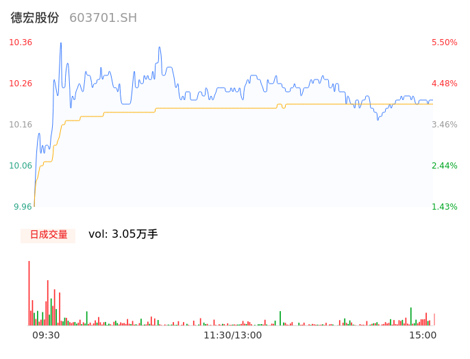 04月24日,德宏股份收报10.25,股价涨幅4.38%,成交金额3115.06万元,换手率1.17%。