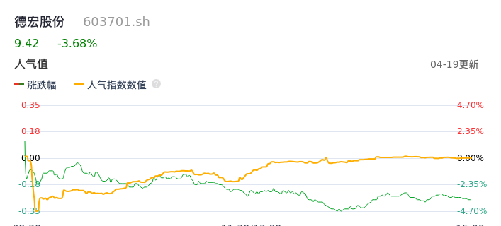 04月19日,德宏股份收报9.42,股价涨幅-3.68%,成交金额3342.83万元,换手率1.35%。