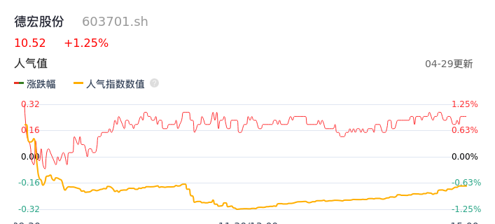 04月29日,德宏股份收报10.52,股价涨幅1.25%,成交金额3090.57万元,换手率1.13%。