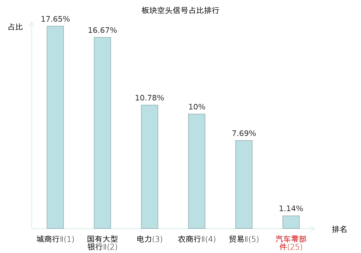 全市场所有行业板块中主力空头信号占比排名中,城商行Ⅱ板块位居第一。化学原料板块名次提升最快,较昨日上升122位。