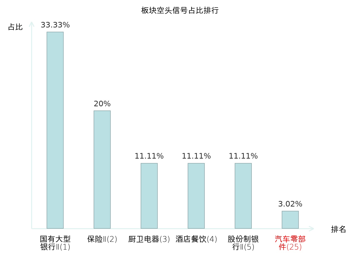全市场所有行业板块中主力空头信号占比排名中,国有大型银行Ⅱ板块位居第一。铁路公路板块名次提升最快,较昨日上升114位。