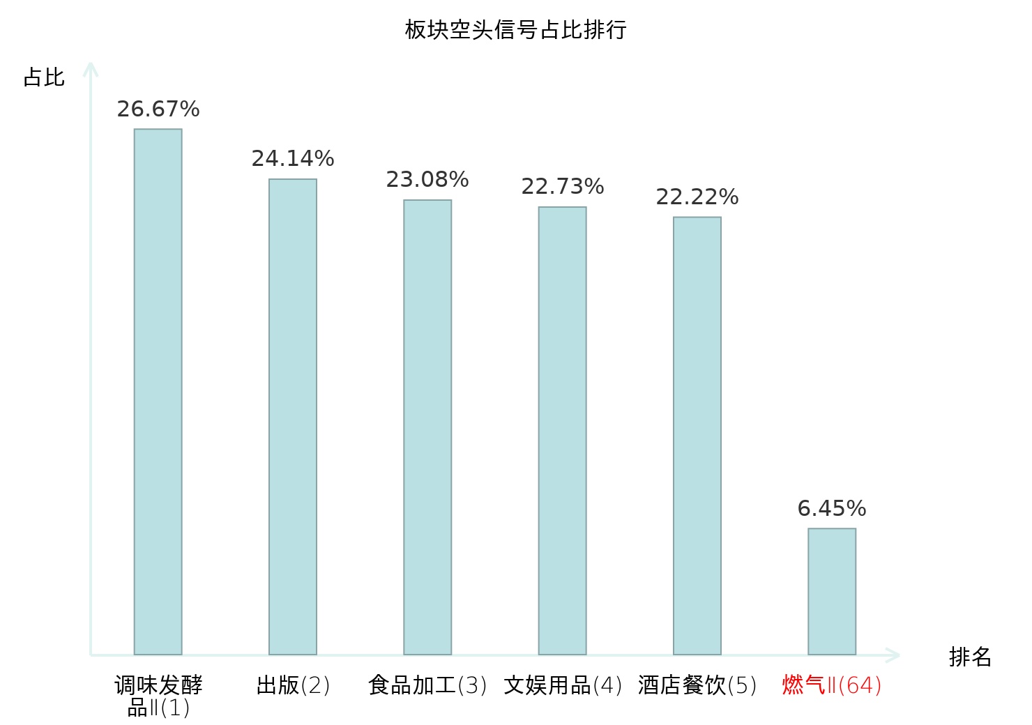 全市场所有行业板块中主力空头信号占比排名中,调味发酵品Ⅱ板块位居第一。中药Ⅱ板块名次提升最快,较昨日上升110位。