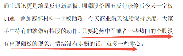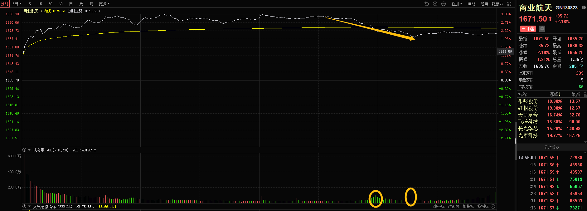 而下午这轮商业航天的人气股【航天发展】2点之前出现炸板跳水。而商业航天指数也是在这之后开始回落。除此之外航天科技、航天电子也有出现炸板回落的走势,航天环宇、乾照光电、航天智装这些热门的趋势大涨股也是集体翻绿,考虑到商业航天连续2天大涨高潮,短期是会获利盘的止盈引发的分歧的,而航天发展目前股价只是炸板还没有出现走弱迹象,明天则是重要的观察日,如果就连几个涨停新高的通宇通讯、顺灏股份也走的不强,不及预期的话,则会有更大的调整预期。