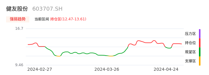 我们来看一下该股的九方特色指标强弱趋势的情况:健友股份近日从观望区上穿到持仓区。股价短期站稳多头区域,上升动能仍较为充足,可积极关注。后续重点关注上方压力位:13.61元是否能突破上攻。
