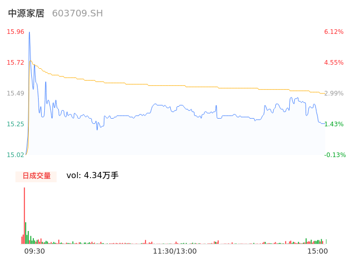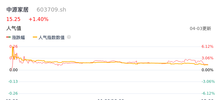 04月03日,中源家居收报15.25,股价涨幅1.40%,成交金额6715.13万元,换手率4.52%。