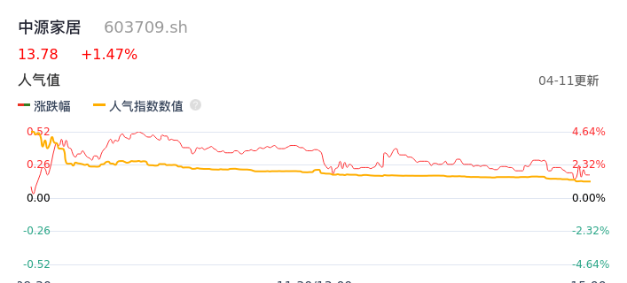 04月11日,中源家居收报13.78,股价涨幅1.47%,成交金额3698.08万元,换手率2.76%。