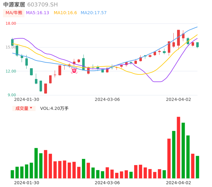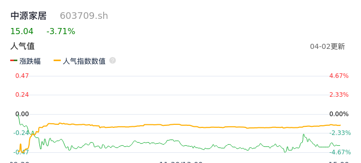 04月02日,中源家居收报15.04,股价涨幅-3.71%,成交金额6334.71万元,换手率4.37%。