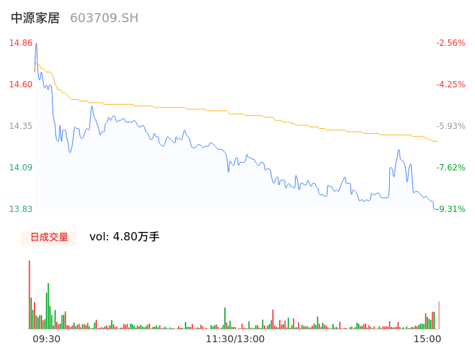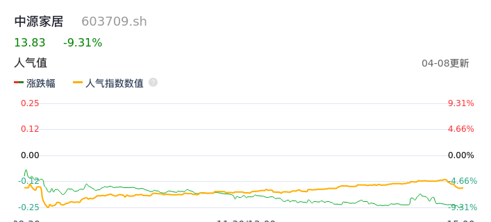 04月08日,中源家居收报13.83,股价涨幅-9.31%,成交金额6837.29万元,换手率5.00%。