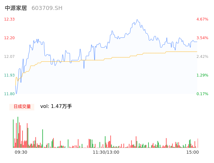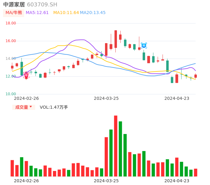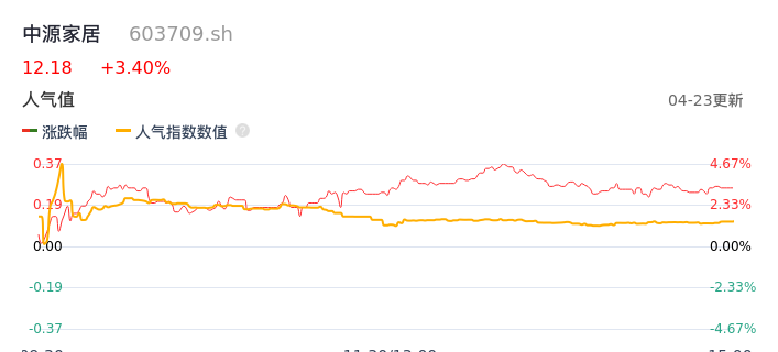 04月23日,中源家居收报12.18,股价涨幅3.40%,成交金额1778.62万元,换手率1.53%。