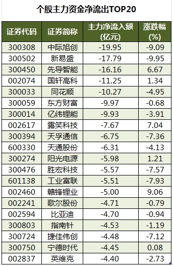 今日有3077只个股被主力资金净卖出,其中,120股被主力资金净卖出超1亿元。主力资金净流出最多的个股是中际旭创,净流出金额为19.95亿元;主力资金净流出居前的个股还有新易盛、先导智能、国轩高科、同花顺、东方财富等,净流出金额分别为17.79亿元、16.16亿元、11.25亿元、10.27亿元、9.97亿元。