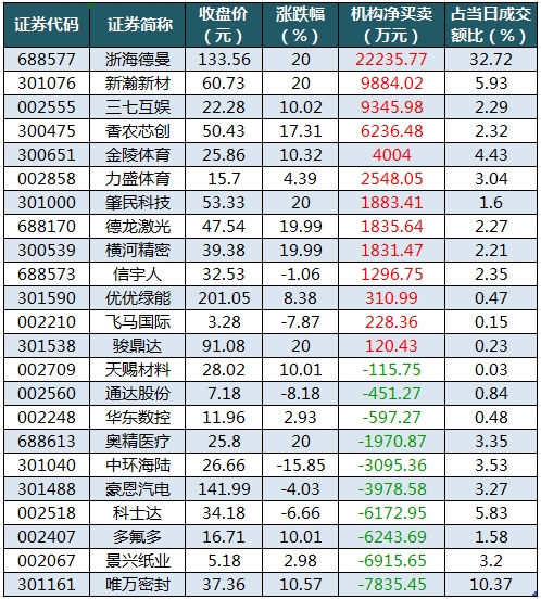 盘后龙虎榜数据显示,今日机构席位资金合计净买入约2.44亿元。其中,净买入的个股13只,净卖出的个股10只。机构净买入最多的股票是浙海德曼,净买入金额约2.22亿元;机构净买入居前的还有新瀚新材、三七互娱、香农芯创等股。机构净卖出最多的股票是唯万密封,净卖出金额约7835.45万元;机构净卖出居前的还有景兴纸业、多氟多、科士达等股。