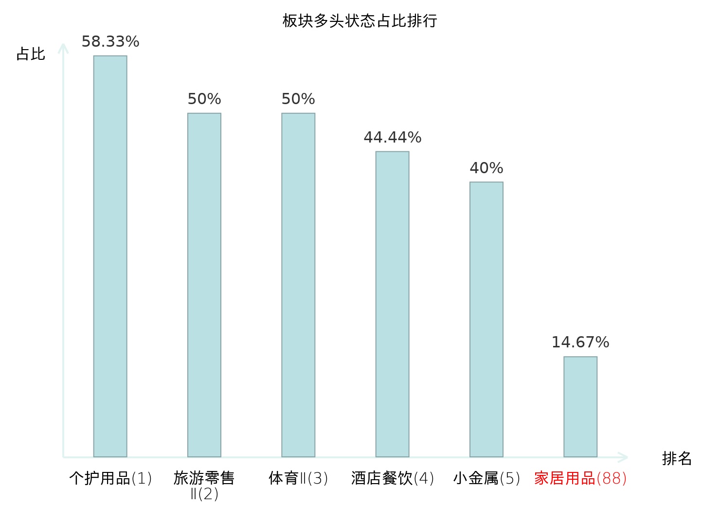全市场所有行业板块中主力多头状态占比排名中,个护用品板块位居第一。乘用车板块名次提升最快,较昨日上升87位。