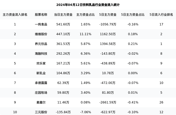 从主力资金流向来看,饮料乳品行业今日主力资金流入7.00亿元,在所有申万二级行业中排名:46/131。