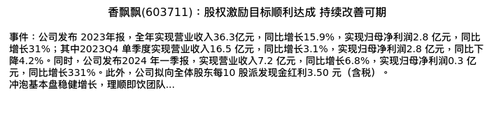 值得注意的是:2024年04月西南证券的朱会振/夏霁分析师,首次发布关于香飘飘的研究报告,标题为:香飘飘(603711):股权激励目标顺利达成 持续改善可期。