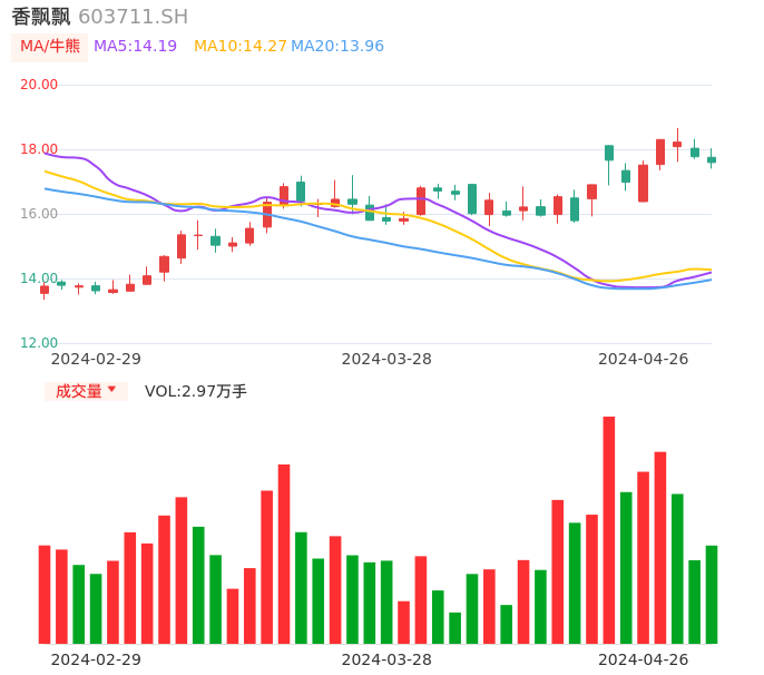 04月26日,香飘飘收报17.59,股价涨幅-1.01%,成交金额5257.77万元,换手率0.72%。