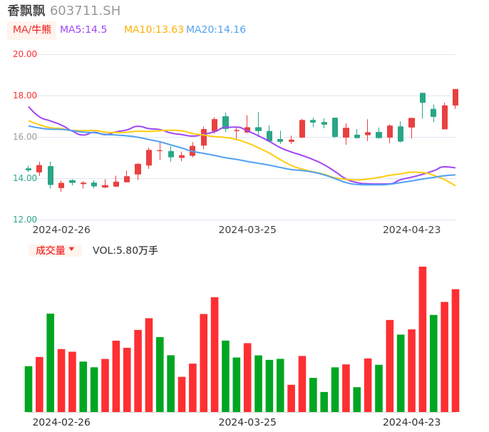 04月23日,香飘飘收报18.30,股价涨幅4.51%,成交金额1.04亿元,换手率1.41%。