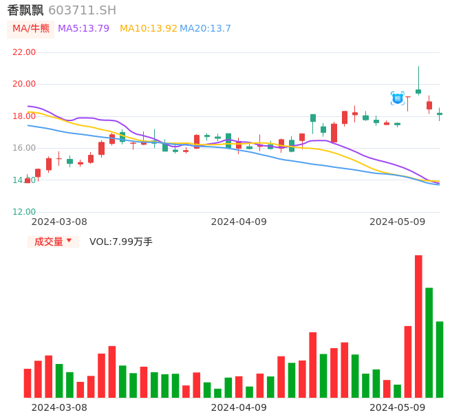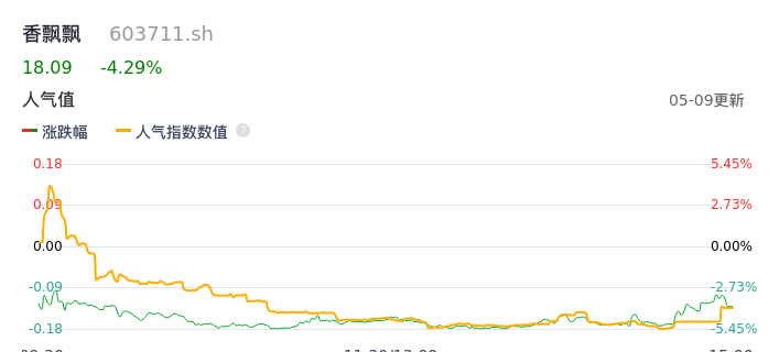 05月09日,香飘飘收报18.09,股价涨幅-4.29%,成交金额1.44亿元,换手率1.94%。