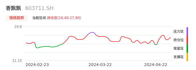 我们来看一下该股的九方特色指标强弱趋势的情况:香飘飘自04月17日从观望区上穿到持仓区。股价近期在多头区域持续强势上扬,上升动能仍较为充足,可积极关注。后续重点关注上方压力位:17.90元是否能突破上攻。