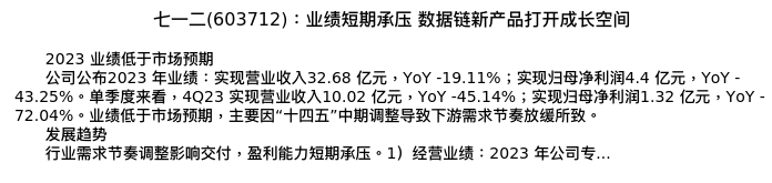 值得注意的是:2024年04月中金公司的刘中玉/陈显帆/刘婧分析师,首次发布关于七一二的研究报告,标题为:七一二(603712):业绩短期承压 数据链新产品打开成长空间。
