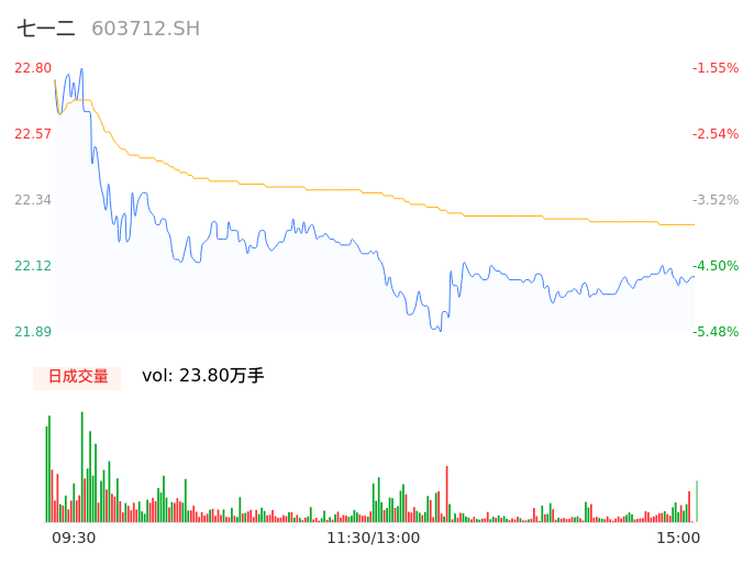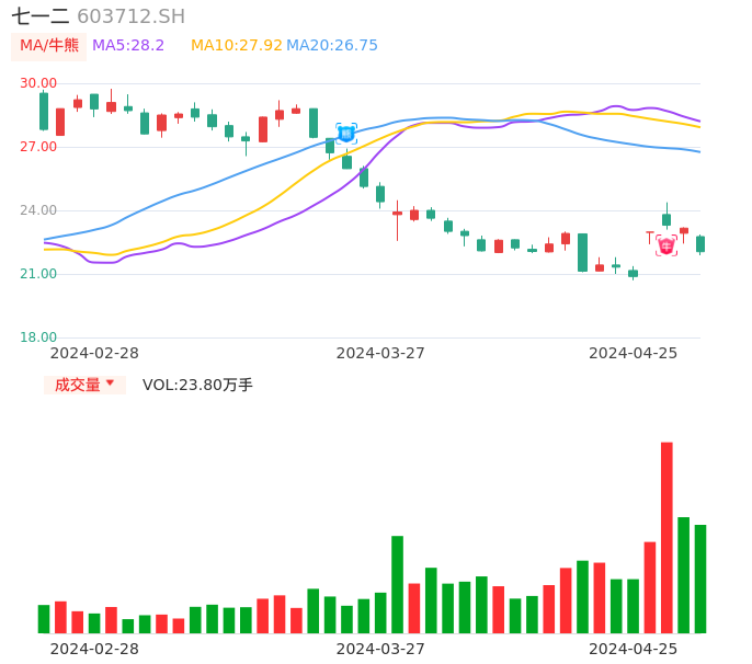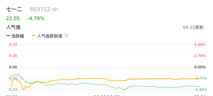 04月25日,七一二收报22.05,股价涨幅-4.79%,成交金额5.30亿元,换手率3.08%。