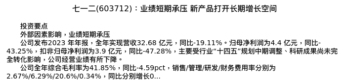 值得注意的是:2024年03月浙商证券的张建民/王逢节分析师,首次发布关于七一二的研究报告,标题为:七一二(603712):业绩短期承压 新产品打开长期增长空间。