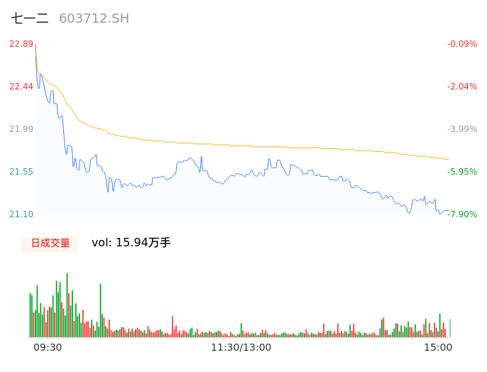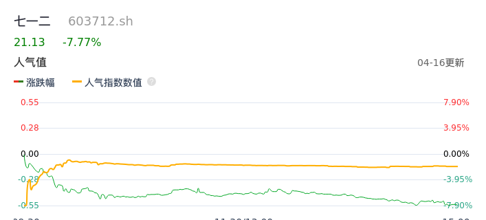 04月16日,七一二收报21.13,股价涨幅-7.77%,成交金额3.46亿元,换手率2.07%。