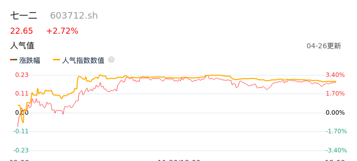 04月26日,七一二收报22.65,股价涨幅2.72%,成交金额5.10亿元,换手率2.94%。