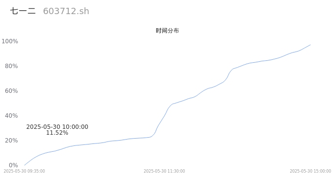 603712七一二2025年05月30日成交18.61万手,成交金额3.75亿,相较昨日放量9.82万手,换手率2.41%,成交清淡。
