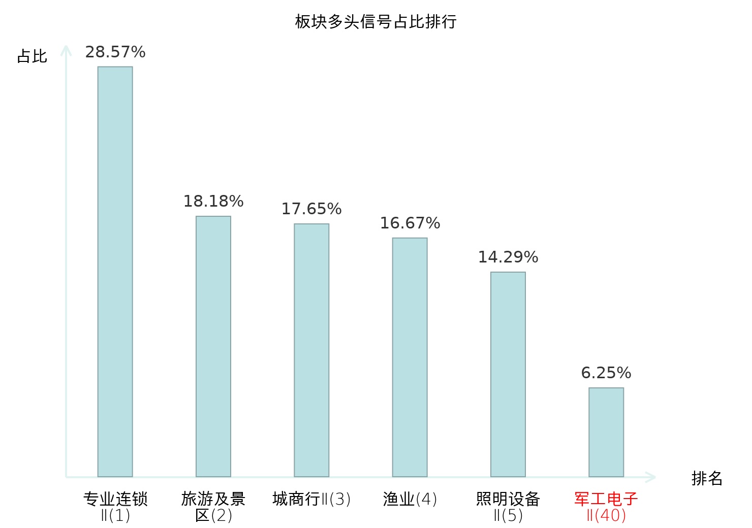 全市场所有行业板块中主力多头信号占比排名中,专业连锁Ⅱ板块位居第一。专业连锁Ⅱ板块名次提升最快,较昨日上升120位。